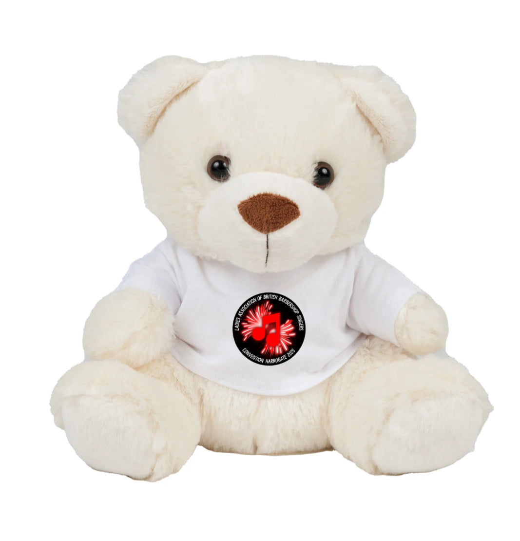 Join the teddy bear's picnic fun with this adorable Bear wearing a white 100% cotton t-shirt featuring the Harrogate 2025 firework logo. With its soft cream fur and standing 20cm tall, it's ready for cuddles and adventures!